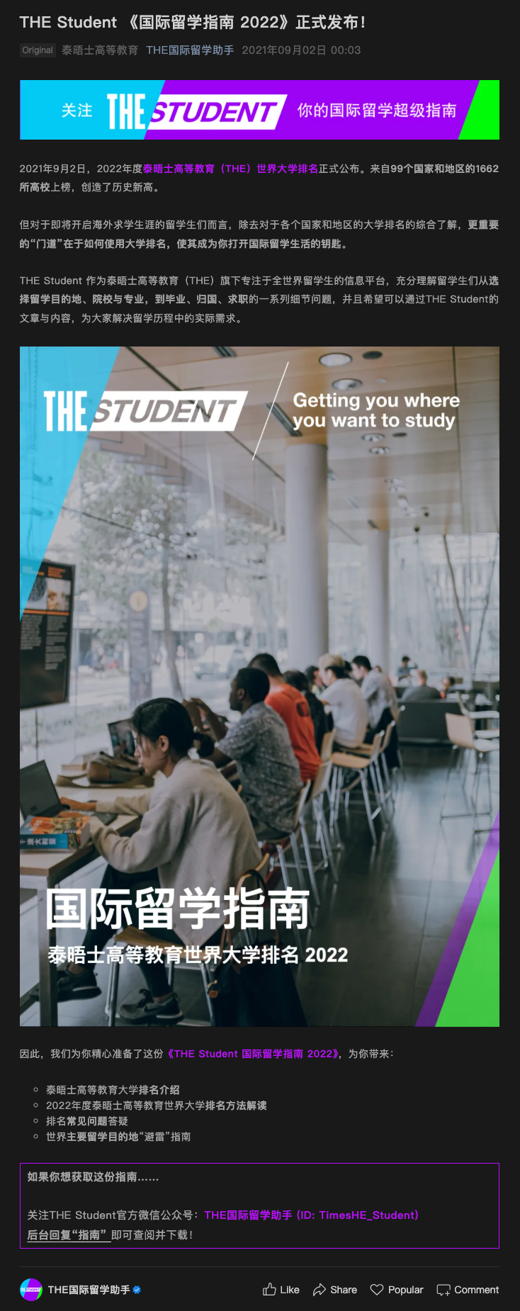 As a platform connecting global prospective international students, I took an initiative to build a THE Student WeChat to attract Chinese students.