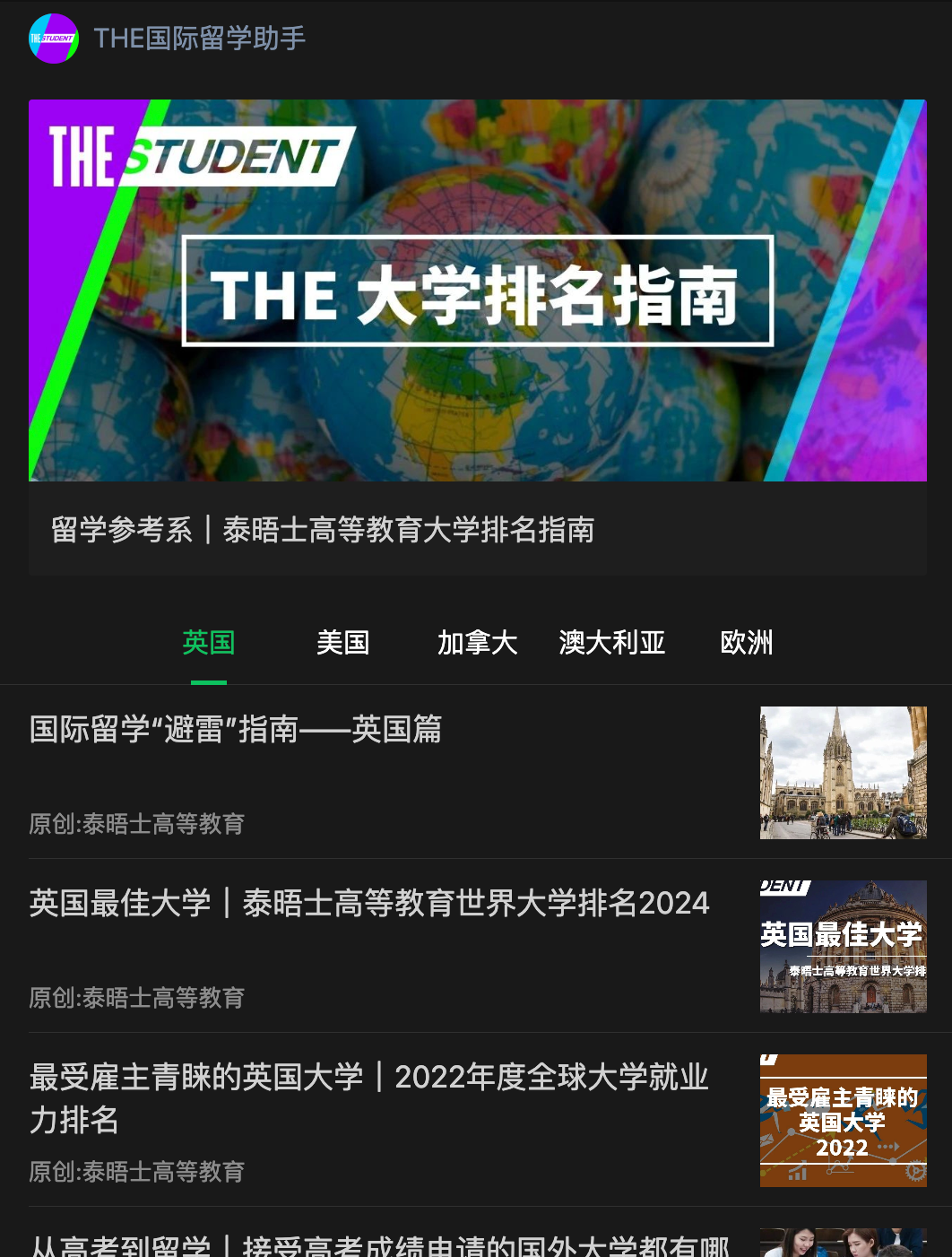 An original Chinese-language guide covering 4 major overseas study countries were created to attract Chinese students, and were used for a benefit of following THE Student's WeChat Account.